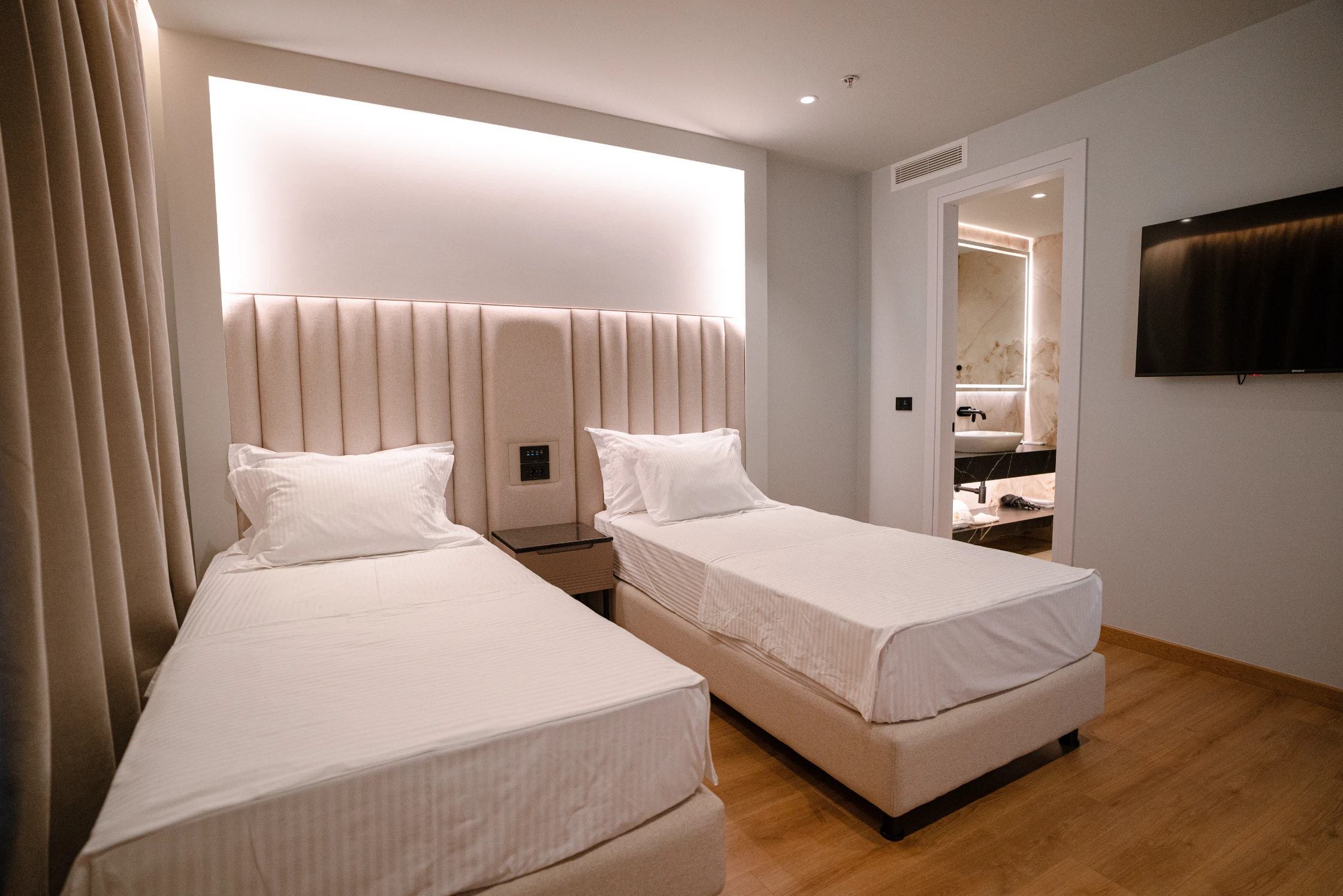 The Premium Suite Sea View offers a spacious 41.3 m² layout, ideal for families seeking comfort and privacy. The suite features two separate rooms, including one bedroom with a double bed and a second bedroom with two single beds, providing ample space for a relaxing stay.