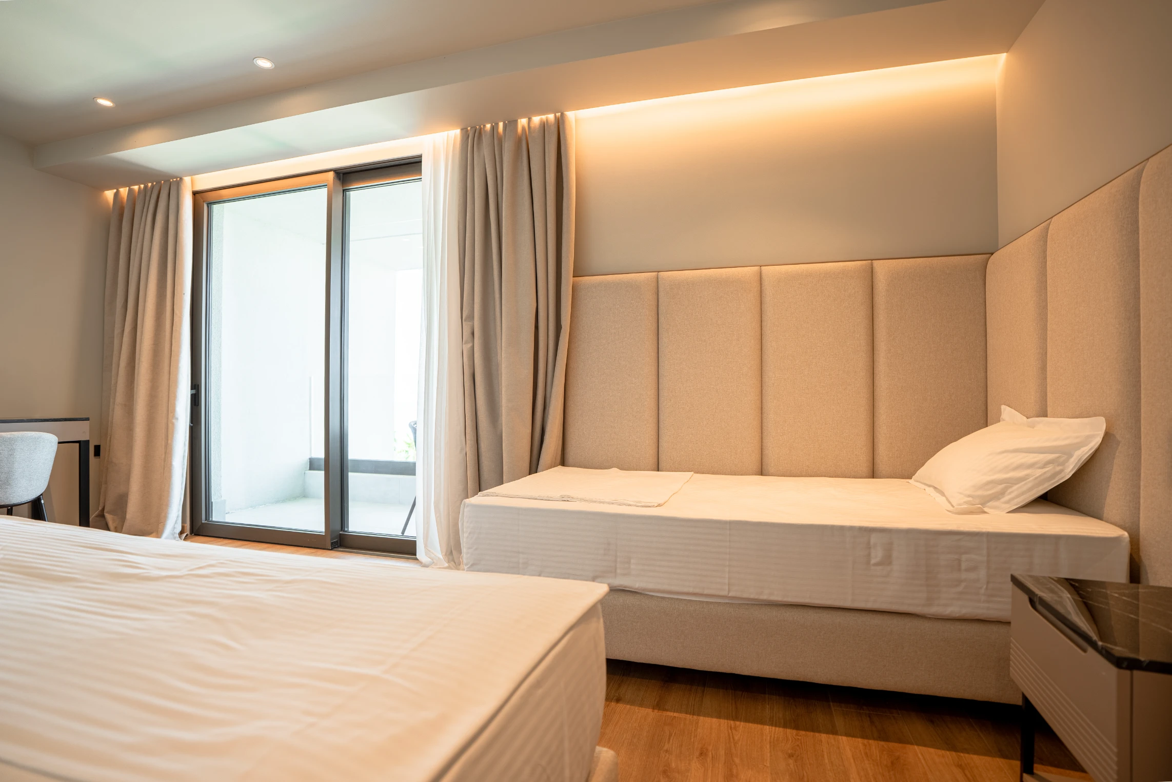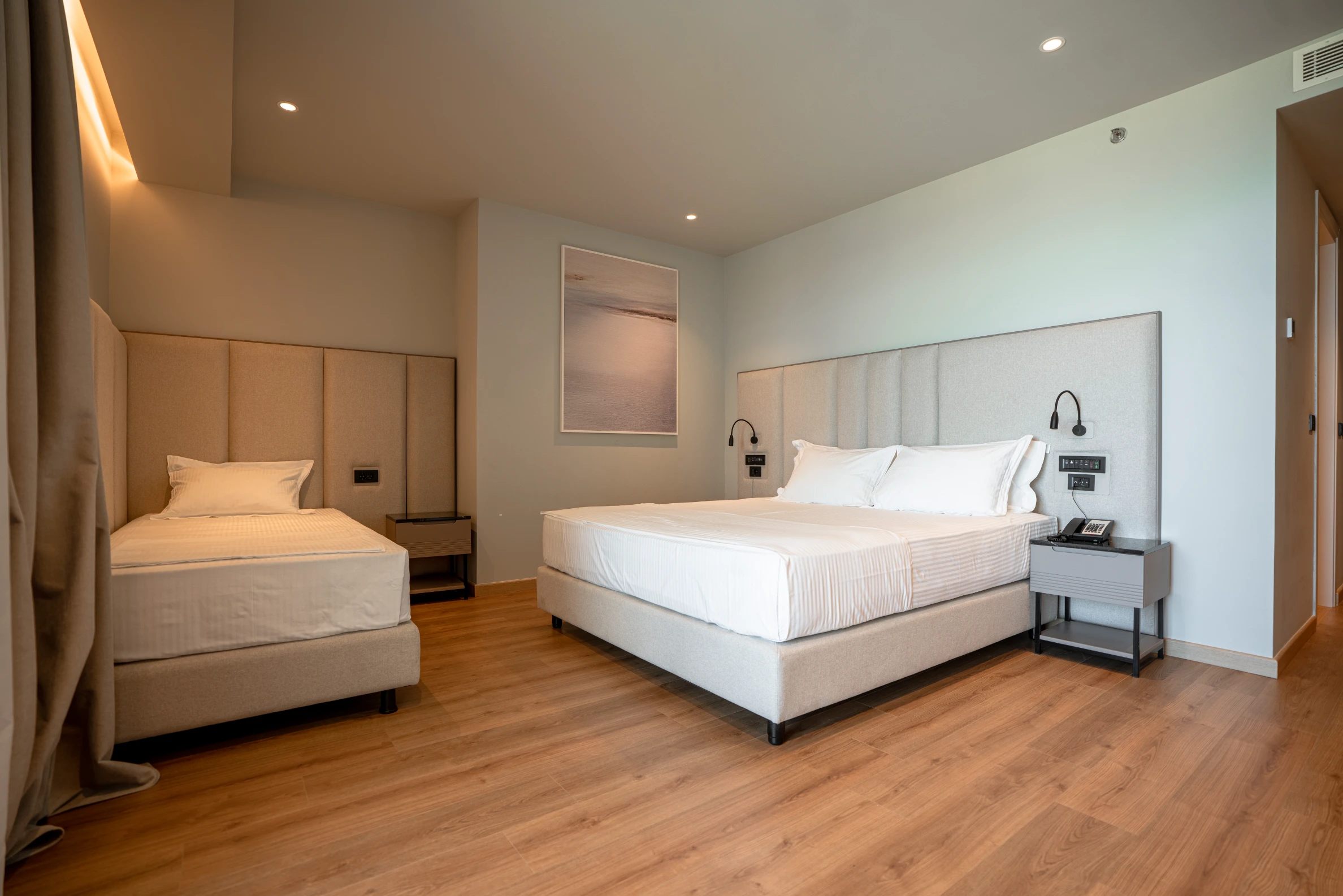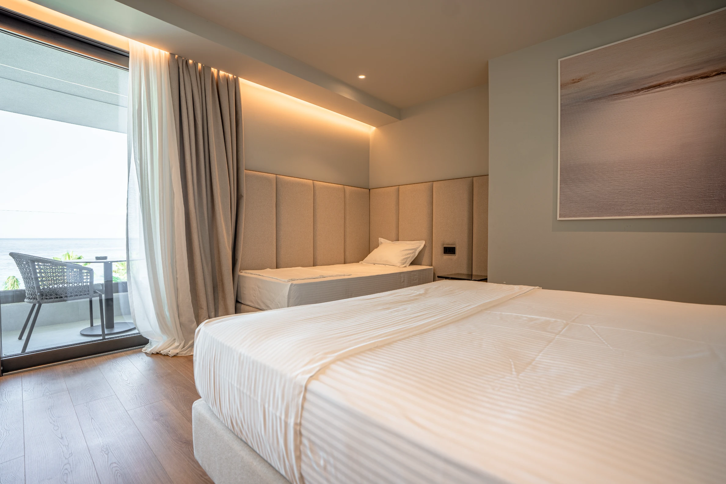 The Triple Room Sea View offers a spacious 34 m² layout with beautiful sea views, making it an ideal choice for families or small groups. The room features one double bed and one single bed and can comfortably accommodate up to 3 guests.